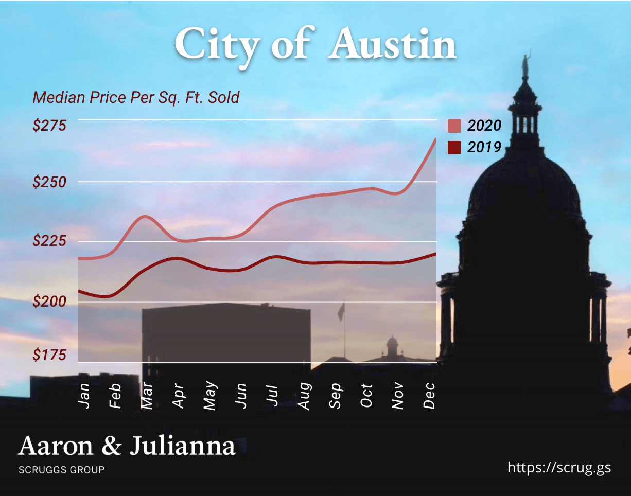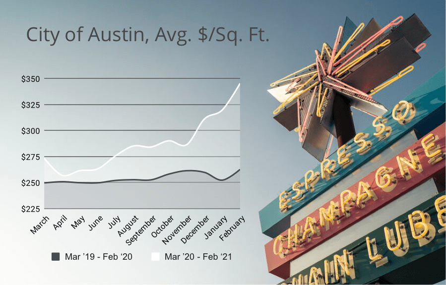 In 2021, the average sales price for all homes in the City of Austin grew $113K (17%) to $745K. The average condo price jumped $127K (27%) while single-family grew $107K (16%). Meanwhile, housing inventory hit all-time lows three times last year. The first time was in January with 0.68 months' supply. Then it happened again in March with 0.63 months’. Finally last month, inventory was the lowest it has ever been, with only 0.61 months' supply.