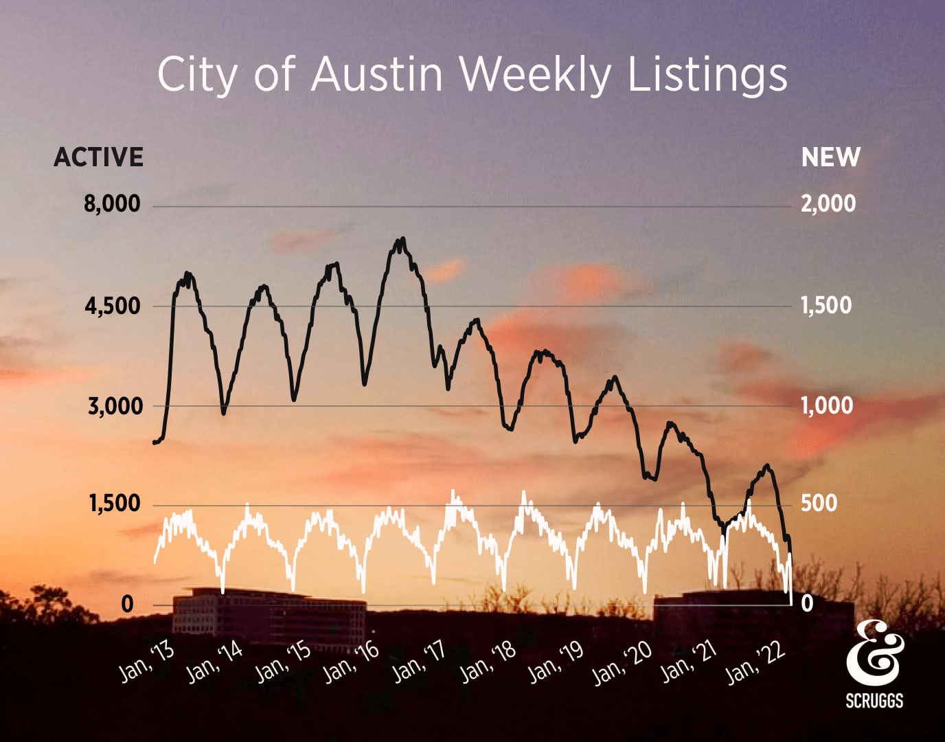 Austin housing prices are skyrocketing because demand has grown for 5-years while the number of new listings remains unchanged. There were 17,837 new listings in 2021. This was almost equal to 2020’s 17,833 listings. In 2021, 16,030 homes sold in Austin, with a total cost of $11.38Billion. Although the number of sales only grew 2% over 2020, the total amount paid for Austin homes grew 29%. We closed out 2021 with only 826 homes for sale. That is 27% fewer active listings than December 2020.